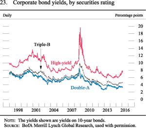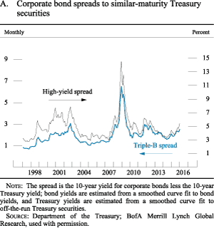 Credit spreads in the corporate sector have widened across the credit spectrum. The spread of yields on investment-grade corporate bonds to yields on Treasury securities of comparable maturity rose moderately, and credit spreads on speculative-grade bonds widened substantially. Spreads for firms in the energy sector increased particularly sharply, reflecting the further drops in the price of oil since late June. Mutual funds investing in speculative-grade bonds experienced significant outflows over the second half of 2015 and early 2016, and, in December, redemptions from one such fund were suspended. During the second half of last year, the respondents to the Senior Credit Officer Opinion Survey on Dealer Financing Terms reported a moderate deterioration in liquidity and market functioning in speculative-grade corporate bonds and some tightening of the terms under which dealers were willing to provide financing to clients against such bonds.3 In addition, some metrics of corporate bond market liquidity suggest a slight deterioration over the second half of 2015 and early 2016, though most indicators remain at levels comparable with those seen prior to the crisis. For further discussion of corporate bond markets and other financial stability issues, see the box "Developments Related to Financial Stability."