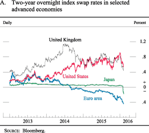 As recovery has gradually taken hold in the U.S. economy over the past few years, both activity and inflation in the advanced foreign economies (AFEs) have remained persistently weak. This divergence in the economic outlooks for the United States and the AFEs has led to expectations of divergence in their monetary policies. Although the Federal Reserve raised its target for the federal funds rate in December, policy rates in most AFEs are near zero (and negative for several economies) and are expected to remain low for several years. Furthermore, the European Central Bank (ECB) and Bank of Japan are providing further monetary accommodation through sizable asset purchase programs, and both of these central banks have indicated that asset purchases will continue, given that inflation remains well below target. Given this ongoing monetary easing, the average policy rate expected by market participants over the next 24 months has declined in the euro area and Japan since 2014, while that of the federal funds rate gradually increased over this period as "liftoff" approached (figure A).