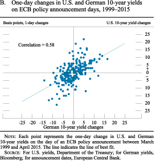 Second, the effect of monetary policy actions on financial conditions may spill over to interest rates in other countries. For example, on ECB policy announcement days, changes in U.S. and German long-term sovereign yields historically have been highly correlated (figure B); similarly large correlations are observed between U.S. and German yields on days when the Federal Reserve has made policy announcements. In the context of economic and policy divergences, these monetary policy spillovers may alter financial conditions in other countries in ways that are not necessarily consistent with their cyclical stabilization needs. For example, recent monetary easing abroad likely has had a tempering effect on longer-term U.S. interest rates that partially offsets the effect of our own policy normalization. Analogously, reduced monetary accommodation in the United States likely will partially offset the effect of greater monetary accommodation abroad. However, the implications of current policy divergences for monetary spillovers should not be exaggerated: U.S. policy remains accommodative and, on net, likely continues to contribute to accommodative conditions abroad.