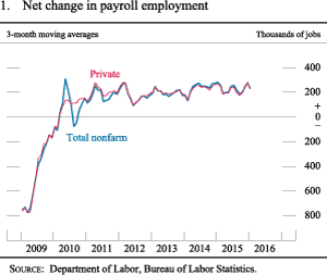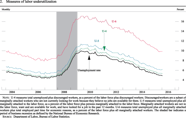 Labor market conditions strengthened further across a variety of dimensions over the second half of 2015 and early this year. Payroll employment gains remained robust, averaging about 235,000 per month over the second half of last year, similar to the gains over the first half; factoring in the January increase of about 150,000, monthly gains since June have averaged about 225,000 (figure 1). The increase in 2015 followed an even faster pace of job gains in 2014, and, in total, some 5-3/4 million jobs were added over the two years. In addition, the unemployment rate--which had reached 10 percent in late 2009--declined from 5.3 percent in June 2015 to 4.9 percent in January of this year; this level is 3/4 percentage point lower than a year earlier and is equal to the median of FOMC participants' estimates of its longer-run normal level (figure 2). Broader measures of labor underutilization, such as those including individuals who are classified as marginally attached to the labor force, declined by similar amounts. (A "marginally attached" individual is defined as someone who is not looking for work currently and therefore treated as not in the labor force, but who wants and is available for work and has looked for a job in the past 12 months.)