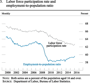 While payroll employment and the unemployment rate have improved further since mid-2015, the labor force participation rate fell from an average of 62.7 percent of the working-age population during the second quarter of 2015 to 62.5 percent in the fourth quarter; the participation rate moved back up to 62.7 percent in January (figure 3). Changing demographics--most notably the increasing share of older people in the population, who are less likely to be in the labor force--and other longer-run structural changes in the labor market have continued to push down the participation rate even as cyclical forces have been pushing it up. That said, labor force participation appears to remain a little weaker than can be explained by structural factors alone, pointing to the likelihood that some slack remains in this dimension of labor utilization. In addition, although the share of workers who are employed part time but would like to work full time has fallen noticeably since June, it is still relatively high, indicating some scope for improvement on this dimension as well.
