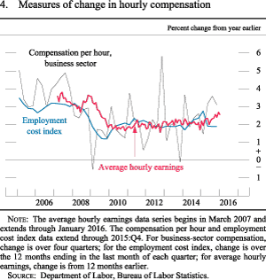 As the labor market has continued to improve, the rates of increase in some measures of hourly labor compensation have begun to pick up while others remain relatively subdued. For example, average hourly earnings for all employees increased 2-1/2 percent over the 12 months ending in January, above the 2 percent pace seen throughout most of the recovery (figure 4). In addition, compensation per hour in the business sector--a volatile measure derived from the labor compensation data in the national income and product accounts, or NIPA--is reported to have increased more quickly in 2015 than its average pace throughout most of the recovery. In contrast, the employment cost index for private industry workers, which measures both wages and the cost to employers of providing benefits, increased about 2 percent over the 12 months ending in December, similar to the pace seen throughout most of the recovery. All of these measures of compensation are increasing at slower rates than those seen prior to the recession. This deceleration probably reflects a variety of factors, including the slower growth of productivity, the slower pace of inflation, and perhaps some remaining slack in the labor market. Despite the continued relatively small increases in nominal wages, the recent very low inflation led to a noticeably larger wage gain last year on a purchasing-power-adjusted (or so-called real) basis than had been evident earlier in the expansion.