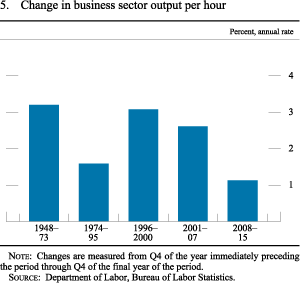 Over time, increases in productivity are a key determinant of the rise in real wages and living standards. Labor productivity in the business sector increased at an annual rate of just 1/2 percent in 2015 and at an average annual rate of just 1 percent since the last business cycle peak in 2007 (figure 5). The average pace since 2007 is a little below the 1974-95 average and well below the pace during the period from the mid-1990s to 2007. The reasons behind the slower productivity performance in recent years are not well understood, but one factor seems to be the slower pace of capital accumulation.