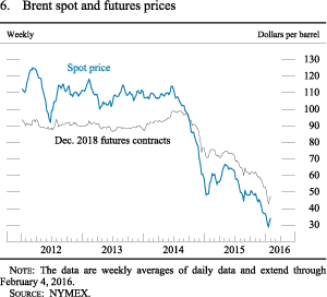 Since July, the price of crude oil has fallen appreciably further, on net, with the spot price of Brent crude oil dropping below $35 per barrel, a level last seen more than a decade ago (the blue line in figure 6). Futures prices have also dropped significantly and indicate that market participants expect only modest price increases over the next few years. Although concerns about global growth have contributed to the fall in prices, much of the recent decline can be attributed to the abundance of global supply. Reductions in U.S. production have been slower and smaller than expected, and OPEC has abandoned its official production target in favor of maintaining robust production despite declining prices and the likely increase in Iranian oil exports in the coming months. The drop in crude oil prices continues to pass through to gasoline prices: The national average of retail gasoline prices (on a seasonally adjusted basis) moved down from more than $2.50 per gallon in June to about $2.00 per gallon in January.