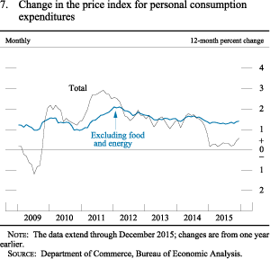 Largely because of the decline in energy prices, overall consumer price inflation, as measured by the PCE price index, was running at just 1/4 percent for the 12 months ending in June 2015; the 12-month change remained near that pace until year-end, when it edged up to 1/2 percent as some of the sharpest declines from a year earlier fell out of the 12-month calculation (figure 7).