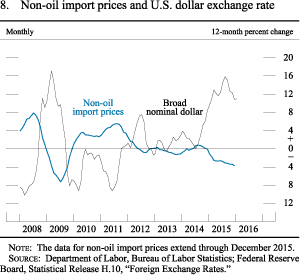 As is also discussed in the box "Effects of Movements in Oil Prices and the Dollar on Inflation," another important factor holding down inflation has been the behavior of import prices. After declining sharply in the first half of 2015, non-oil import prices continued to fall in the second half, albeit at a slightly more modest pace; the further declines in the second half reflected lower commodity prices as well as additional increases in the foreign exchange value of the dollar (figure 8). In addition, slack in labor and product markets likely placed downward pressure on inflation, although this factor has probably waned significantly. For all of these reasons, inflation for items other than food and energy (so-called core inflation) remained modest. Core PCE prices rose about 1-1/2 percent over the 12 months ending in December, similar to the increase in 2014.