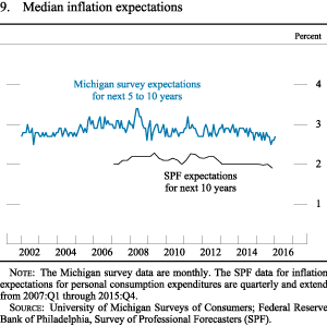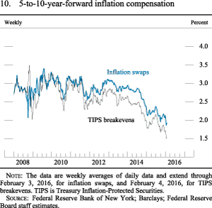 Wage- and price-setting decisions are likely influenced by expectations for inflation. Survey measures of longer-term inflation expectations have been quite stable over the past 15 years but appear to have moved down some lately, including over the past 6 months, to the lower end of their historical ranges. This decline has occurred both for the measure of inflation expectations over the next 5 to 10 years as reported in the University of Michigan Surveys of Consumers and for the median expectation for the annual rate of increase in the PCE price index over the next 10 years from the Survey of Professional Forecasters, conducted by the Federal Reserve Bank of Philadelphia (figure 9). Market-based measures of medium- (5-year) and longer-term (5-to-10-year-ahead) inflation compensation derived from the difference between yields on nominal Treasury securities and Treasury Inflation-Protected Securities moved down further, on net, over the second half of the year after having declined notably between mid-2014 and mid-2015 (figure 10). Although changes in inflation compensation could reflect changes in expected inflation, they also may reflect a variety of other considerations, including an inflation risk premium, liquidity premiums, and other factors. 1