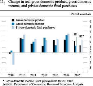 Real GDP is reported to have increased at an annual rate of 1-1/4 percent in the second half of last year, slower than the first-half pace (figure 11). As in the first half of the year, economic activity during the second half was supported by solid gains in private domestic final purchases--that is, final purchases by households and businesses--and by modest increases in government purchases of goods and services. By contrast, aggregate demand continued to be held down by weak export performance, reflecting the rise in the foreign exchange value of the dollar and sluggish foreign economic growth. In addition, inventory investment slowed markedly from its elevated first-half pace, thereby reducing overall GDP growth in the second half of 2015.