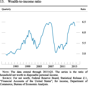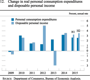 Real personal consumption expenditures rose at an annual rate of 2-1/2 percent in the second half of 2015, about the same as the first-half pace (figure 12). These increases have been supported by income gains from the improving labor market as well as the fall in gasoline and other energy prices, which has bolstered consumers' purchasing power. As a result, real disposable income--that is, income after taxes and adjusted for price changes--rose a robust 3-1/2 percent in 2015 after a similar gain in 2014.