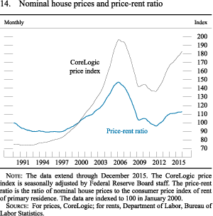 Consumer spending last year was also likely supported by further increases in household net worth. Although the value of corporate equities edged down last year, prices of houses--which are owned much more widely than are corporate equities--posted significant gains, and the wealth-to-income ratio remained elevated relative to its historical average (figure 13). In nominal terms, national house price indexes are now close to their peaks of the mid-2000s, but relative to rents, house price valuations are much lower than a decade ago (figure 14).