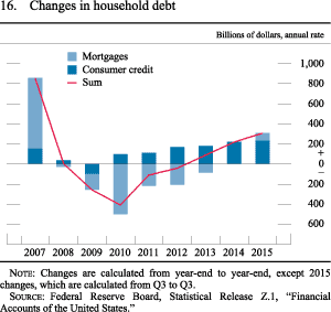 Consumer credit continued to expand moderately through late 2015, as lending standards for both auto lending and student loans remained accommodative (figure 16). In addition, credit card lending has been rebounding since early last year. Standards and terms on credit cards are still relatively tight for riskier borrowers, although there has been some modest increase in access for borrowers with subprime credit histories. Delinquencies on credit card and auto loans are still near historical lows, in part due to the tight standards.