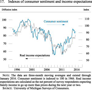 Household spending has also been supported by favorable consumer sentiment. For the past year or so, the overall index of consumer sentiment from the University of Michigan Surveys of Consumers has registered levels comparable to those that prevailed before the recession (figure 17). Rising real incomes, partly driven by falling energy prices and improvements in the labor market, have likely driven up consumer confidence. These same factors are probably behind the more upbeat expectations that households report for real income changes over the next year or two, which are now near pre-recession levels.