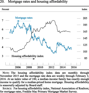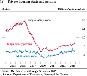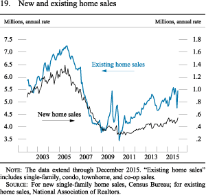 The gradual recovery in residential construction activity continued over the second half of last year. Both single- and multifamily housing starts registered moderate increases in 2015 (figure 18). Sales of new and existing homes also rose moderately, abstracting from the temporary plunge in existing home sales in November, which reportedly reflected a lengthening in closing times due to new mortgage disclosure rules (figure 19). But while multifamily starts have recovered to their pre-recession level, single-family construction continues to be well below its earlier pace. The level of housing starts is still being held down by a meager pace of household formation, tighter-than-average mortgage credit supply, and shortages of skilled labor and other inputs in the construction sector.