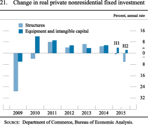 Business investment (private nonresidential fixed investment) rose at an annual rate of only 1/2 percent during the second half of 2015 after increasing at a 3 percent pace during the first half of the year (figure 21). Spending on equipment rose modestly, and a bit faster than during the first half of 2015, but spending on intangibles, such as research and development, and investment in structures outside of drilling and mining flattened out after posting strong gains during the first half of the year. Investment in structures used in the energy sector continued to fall precipitously, as the drop in oil prices has scuttled investment in higher-cost oil and gas wells. For the year as a whole, the pace of overall business investment slowed compared with 2014, mostly as a result of the drop in the energy sector. Investment has been supported by low interest rates and financing conditions that are still generally accommodative, though somewhat less so than earlier.
