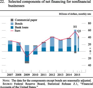Domestic financial conditions for nonfinancial firms have become somewhat less supportive of growth since last June, particularly for non-investment-grade firms. Equity prices have declined and bond spreads have widened amid concerns about the global economic outlook and oil prices. Downgrades of bonds issued by nonfinancial companies have increased, and the leverage of these companies is near the top end of its range over the past few decades. Nonetheless, profitability has remained high outside the energy sector. Against a backdrop of low interest rates, investment-grade nonfinancial businesses have continued to raise substantial amounts of funds in bond and loan markets since last June, in part to finance mergers and acquisitions activity (figure 22). Speculative-grade bond issuance also was solid for much of 2015 but diminished toward the end of the year as spreads widened notably, particularly for firms in the energy sector (figure 23).