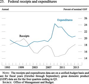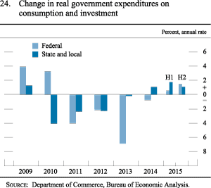 After being a drag on aggregate demand during much of the expansion, federal fiscal policy has shifted to a more neutral stance as fiscal consolidation efforts have abated. During 2015, policy actions had little effect on taxes and transfers, and real federal purchases of goods and services edged up (figure 24).