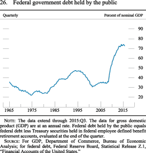 The federal budget deficit narrowed further in fiscal year 2015 to 2-1/2 percent of GDP, largely reflecting the increase in tax receipts owing to the ongoing economic expansion as well as the modest increase in purchases (figure 25). A deficit of this size is small enough to stabilize the ratio of the debt held by the public to nominal GDP; that said, the current level of that ratio is elevated relative to its average over the post-World War II period (figure 26). The Congressional Budget Office projects the deficit to move up to about 3 percent of GDP in fiscal 2016.