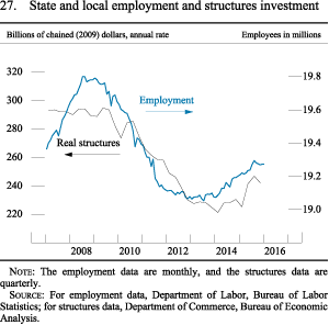 Fiscal conditions of most state and local governments continue to improve gradually. Tax revenues have been rising moderately, supported by the expansion of economic activity and increasing house prices. These governments boosted spending at a moderate rate in 2015. In particular, real state and local purchases of goods and services rose 1-1/2 percent last year, as employment posted another modest gain and real construction spending rose markedly for the first time since the recession (figure 27).