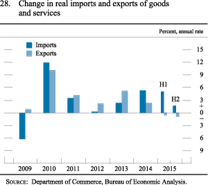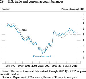 Exports held about flat in the second half of 2015, weighed down by the appreciation of the dollar and by soft foreign economic growth (figure 28). Although the stronger dollar made imports more affordable, import growth was also relatively subdued. Imports for inputs related to oil exploration and production were particularly weak, consistent with steep declines in that industry. In all, real net trade continued to be a drag on real GDP growth in the second half of 2015. Although the real trade balance deteriorated, the nominal trade balance was little changed in 2015 in part because the value of imports declined, largely because of the decline in oil prices. Still, the current account deficit widened a bit to near 3 percent of nominal GDP as U.S. net investment income declined (figure 29).