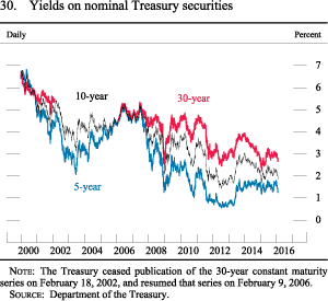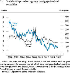 Yields on longer-term nominal Treasury securities have declined since the middle of last year on net (figure 30). The decreases in nominal yields largely reflected reductions in inflation compensation; yields on long-term inflation-protected Treasury securities were little changed. Participants in the U.S. Treasury market reportedly were particularly attentive to developments abroad, especially turbulence in Chinese financial markets, and to fluctuations in oil prices. Consistent with the changes in yields on Treasury securities, yields on 30-year agency mortgage-backed securities (MBS)--an important determinant of mortgage interest rates--decreased, on balance, over the second half of 2015 and early 2016 (figure 31).