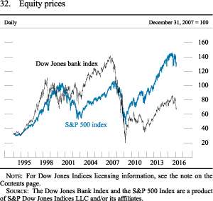 Since the middle of last year, amid considerable volatility, broad measures of U.S. equity prices have decreased notably, on net, as concerns about the foreign economic outlook appeared to weigh on risk sentiment and the outlook for corporate earnings growth (figure 32). Stock prices for companies in the energy and basic materials sectors dropped sharply, reflecting the continued fall in oil and other commodity prices. Implied volatility for the overall S&P 500 index, as calculated from options prices, increased, on balance, since the middle of last year; at times, its movement was notable.