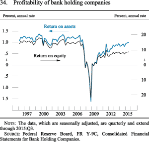 Measures of bank profitability remained below their historical averages but improved slightly during the third quarter of 2015 (the latest available data), supported by lower noninterest expenses (figure 34). Net interest margins were about unchanged, on average, during the third quarter. Delinquency and charge-off rates for most major loan types were generally stable, near or at their lowest levels since the financial crisis.