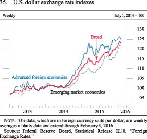 The foreign exchange value of the dollar rose further, on net, since the middle of last year, bringing its increase since mid-2014, when the most recent run-up began, to over 20 percent by the beginning of 2016 (figure 35). Expectations that the Federal Reserve would soon start increasing its policy interest rates, even while most foreign central banks maintained or expanded monetary policy accommodation, boosted the value of the dollar. (For more discussion, see the box "Monetary Policy Divergence in the Advanced Economies.") The dollar has also appreciated against the renminbi since last summer, when the People's Bank of China (PBOC) announced it was changing its policy to allow market forces to play a greater role in determining the renminbi's exchange rate. The PBOC allowed the renminbi to depreciate 3 percent against the dollar in August and another 1-1/2 percent after the turn of the year. These developments, which contributed to intensified uncertainty about China's exchange rate policy and the prospects for its economy, fostered episodes of global market turbulence that further boosted the dollar. Investors became more focused on downside risks to prospects for growth in China and, by implication, global growth. These concerns about growth, along with still-strong oil production and high inventories, contributed to a sharp drop in commodity prices, which in turn weighed on the currencies of several commodity-exporting countries.