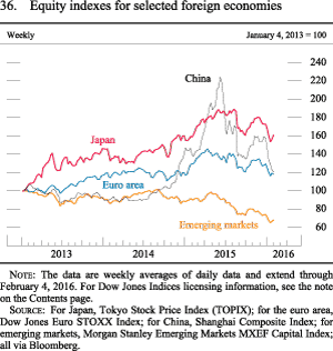 Triggered in part by the unexpected devaluation of the renminbi and an ensuing increase in concerns about global economic growth, equity indexes have dropped, on net, in most emerging market economies (EMEs) and advanced foreign economies (AFEs) since the beginning of the summer (figure 36). In particular, Chinese stock prices tumbled more than 40 percent despite official interventions, including circuit breakers and bans on stock sales, that were intended to mute some of the downward pressure. The fall in Brazilian stock prices was also very sharp, as global market turbulence as well as domestic developments, including a corruption scandal, declining output, and persistent high inflation, prompted stock prices to fall nearly 25 percent since last summer.