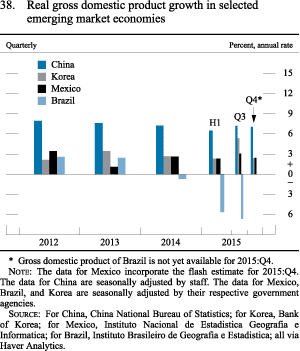 Economic activity in most of emerging Asia, which had been restrained in the first half of the year by soft external demand and by the outbreak of MERS (Middle East Respiratory Syndrome) in South Korea, picked up in the second half, as the drag from these pressures subsided. In China, GDP growth is reported to have held steady around 7 percent in the second half of the year, boosted in part by relatively strong growth in services. However, weak manufacturing, as well as the financial market volatility noted previously, led to a pronounced heightening of concerns about the economy during the second half of the year.