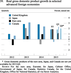 In Canada, where low oil prices induced a mild contraction earlier in the year, economic activity rebounded in the third quarter as exports recovered and business-sector investment contracted at a slower pace. That said, more recent indicators of growth weakened markedly during the fourth quarter. In contrast, in the euro area, Japan, and the United Kingdom, economic activity grew moderately in the third quarter, and recent indicators for fourth-quarter growth, such as purchasing managers indexes, have largely held steady (figure 39).