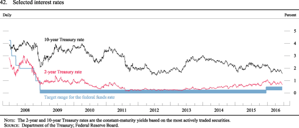 After raising the target range for the federal funds rate last December to between 1/4 and 1/2 percent, the Committee has maintained that range over the first half of the year (figure 42). This unchanged policy stance was supported initially by the Committee's assessment that global economic and financial developments posed risks to the economic outlook, as expressed in its March 2016 statement, and by its judgment in April that growth in domestic economic activity appeared to have slowed. 5 In June, the Committee noted that recent information indicated that the pace of improvement in the labor market had slowed, while growth in domestic economic activity appeared to have picked up in the spring. 6 The decision to maintain the target range for the federal funds rate also reflected the Committee's expectation that inflation would stay low in the near term, partly because of earlier declines in energy prices and in the prices of non-energy imports, as well as recently elevated uncertainty about the possible consequences of the U.K. referendum on European Union membership for the U.S. economic outlook.