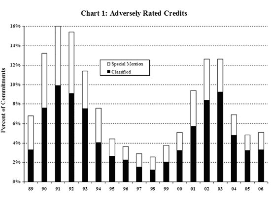 Chart 1:  Adversely Rated Credits.  Total adversely rated credits  rose slightly to 5.1 percent of total commitments from 4.8 percent a year ago.  Similarly, the ratio of classified commitments to total commitments rose slightly to 3.3 percent from 3.2 percent last year.  Total classified commitments rose by $9.4 billion, or 18 percent, since 2005, compared with a net decrease of $21.5 billion, or 29 percent, the previous year.  Commitments rated special mention increased by $7.5 billion, or 29 percent, in contrast to 2005 when they fell by $7.0 billion, or 21 percent.