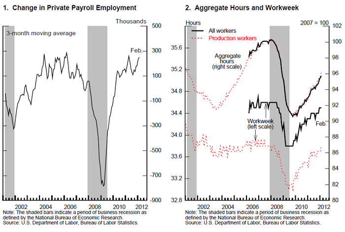 As background for my discussion, let me provide a brief review of recent job market indicators. As this audience is well aware, job creation has picked up recently. Private payroll employment (figure 1) increased by nearly 250,000 jobs per month, on average, in the three months ending in February, and by about 190,000 jobs per month, on average, over the past 12 months. At the same time, layoffs in the public sector appear to be moderating. Together with a lengthening of the average workweek, these employment gains have contributed to a significant increase in aggregate hours worked (figure 2).