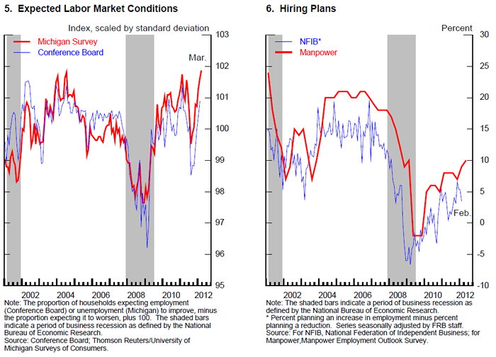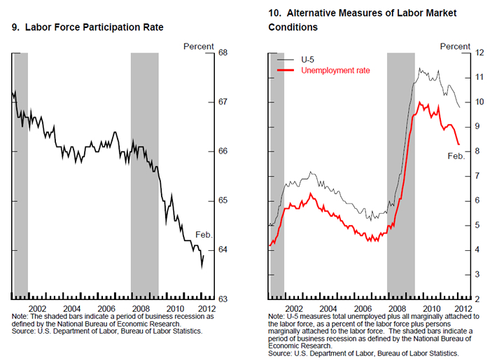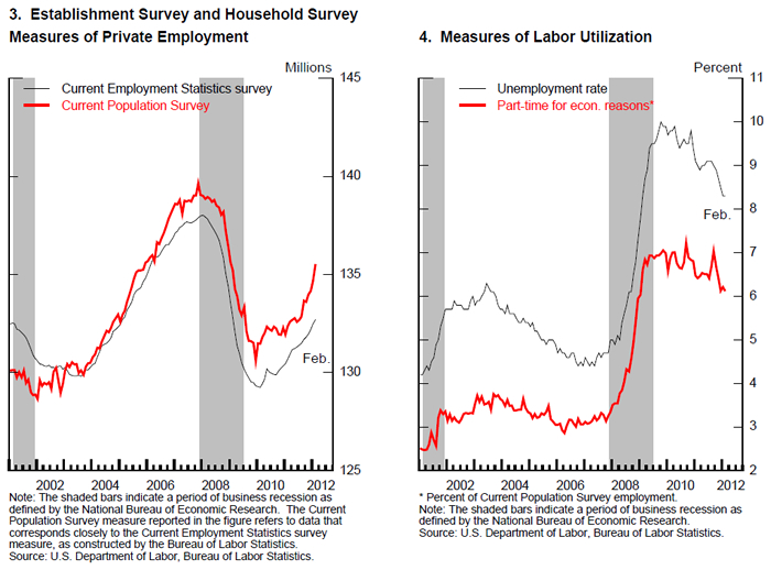 The positive signs from the labor market have shown through to measures of labor utilization: After hovering around 9 percent for much of last year, the unemployment rate (figure 4) has moved down since September to 8.3 percent in February, and the share of employment represented by people working part time for economic reasons, an indicator of underutilization, has declined modestly.