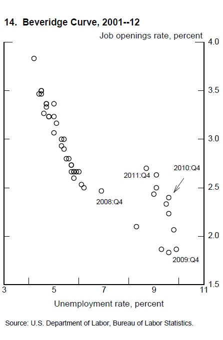 9. For a discussion of shifts in the Beveridge curve during previous recessions, see John Lindner and Murat Tasci (2010), "Has the Beveridge Curve Shifted?" Federal Reserve Bank of Cleveland, Economic Trends, August; and Robert Valletta and Katherine Kuang (2010), "Is Structural Unemployment on the Rise?" Federal Reserve Bank of San Francisco, FRBSF Economic Letter, 2010-34, November 8. For research examining the specific role of mismatch, see Regis Barnichon and Andrew Figura (2010), "What Drives Movements in the Unemployment Rate? A Decomposition of the Beveridge Curve (PDF)," Finance and Economics Discussion Series 2010-48 (Washington: Board of Governors of the Federal Reserve System, August); and Aysegül Sahin, Joseph Song, Giorgio Topa, and Giovanni L. Violante (2011), "Measuring Mismatch in the U.S. Labor Market," unpublished paper, Federal Reserve Bank of New York, July. Other factors affecting the Beveridge curve include the role of extended unemployment benefits and potential effects of lags between vacancies and hiring; on the effects of unemployment benefits, see Robert Valletta and Katherine Kuang (2010), "Extended Unemployment and UI Benefits," Federal Reserve Bank of San Francisco, FRBSF Economic Letter, 2010-12, April 19; on the lag between job vacancies and hiring, see Steven J. Davis, R. Jason Faberman, and John C. Haltiwanger (2010), "The Establishment-Level Behavior of Vacancies and Hiring," NBER Working Paper Series 16265 (Cambridge, Mass.: National Bureau of Economic Research, August), www.nber.org/papers/w16265. Return to text