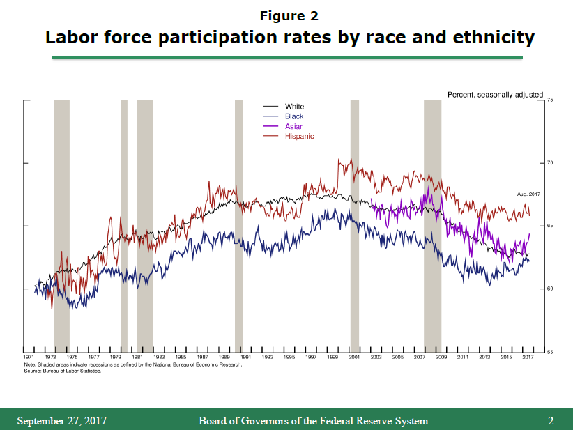 The Federal Reserve is also keenly interested in disparities in employment, labor force participation, income, and wealth because they may have implications for the growth capacity of the economy. When we consider appropriate monetary policy, we need to have a good sense of how fast the economy can grow without fueling excessive price inflation. At a time when the retirement of the baby-boom generation looks likely to be something of a drag on the growth of the labor force, it is especially important to consider whether relatively low levels of employment and labor force participation for some prime working-age groups represent slack that, if successfully tapped, could increase the labor force and boost economic activity.