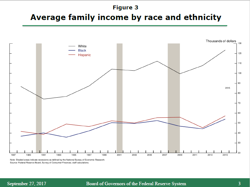11. Staff calculations from forthcoming SCF data. Recent estimates of household income from Current Population Survey data and reported by the Census in Semega, Fontenot, and Kollar (2017) are qualitatively similar, in that between 2013 and 2016 for both sets of data, family income has increased for whites, blacks, and Hispanics (with greater increases, in percentage terms, for black and Hispanic families). Return to text