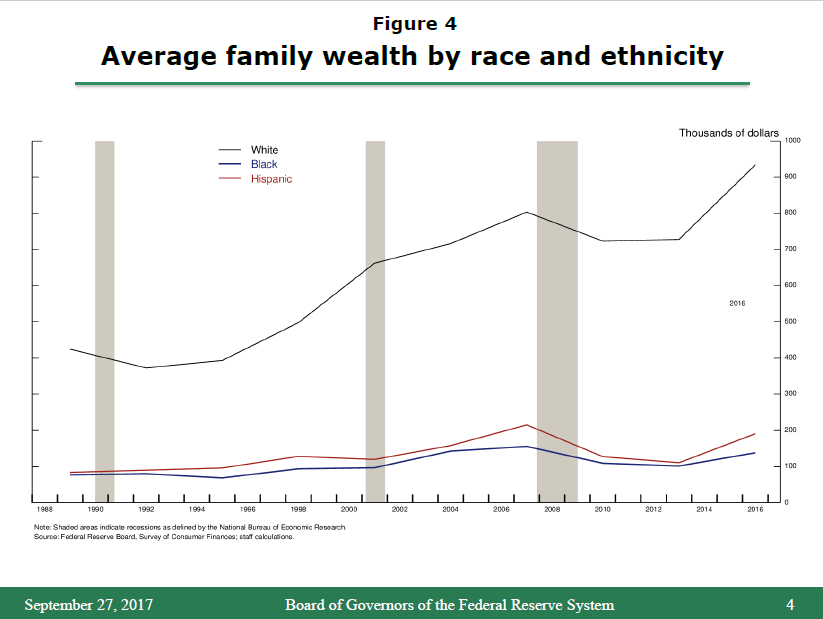 More broadly, the persistent disparities in employment outcomes are mirrored in significant and persistent racial and ethnic differences in families' income and wealth. According to forthcoming findings from the latest SCF and as shown in figure 3, the average income for white families in 2015 was about $123,000 per year, compared with $54,000 for black families and $57,000 for Hispanic families.11 Disparities in wealth, shown in figure 4, are even larger: Average wealth holdings for white families in 2016 were about $933,000, compared with $191,000 for Hispanic families and $138,000 for black families.12 Moreover, these racial and ethnic gaps in average family income and wealth have generally widened rather than narrowed over the past few decades. Based on SCF data, median family wealth has grown much more rapidly for white families than for other families over the past few decades, while median family incomes have risen by about the same amount for white, black, and Hispanic families.