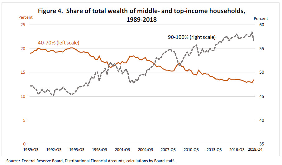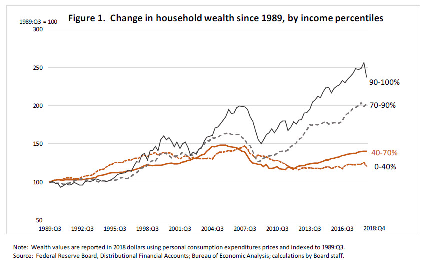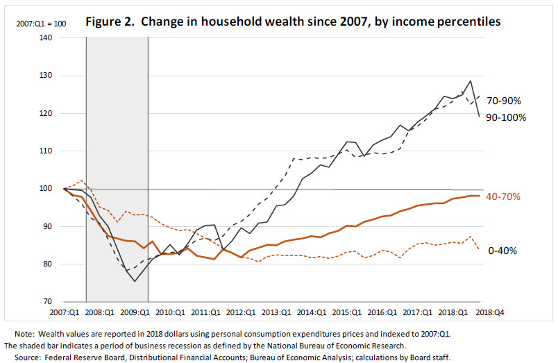 Today I will share with you findings from a promising new data resource developed by Federal Reserve staff, the Distributional Financial Accounts (DFAs). These accounts combine household-level data on balance sheets, incomes, and demographic characteristics of families in the United States from the triennial Survey of Consumer Finances (SCF) with aggregate data from the Financial Accounts of the United States to track the distribution of these household assets and liabilities on a quarterly basis.4 The timeliness of the data, which are currently available through the fourth quarter of 2018, can provide valuable insights into how different types of households are faring over the business cycle.