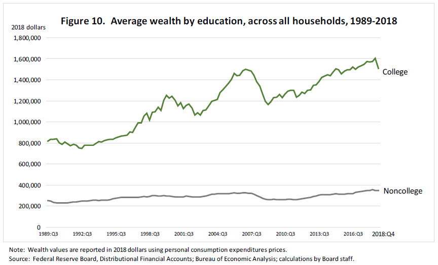 For others, college is seen as an important pathway to middle-class economic security. The average wealth of households with a college degree significantly exceeds the average wealth of those without a college degree (figure 10). A key reason is that college graduates generally have higher incomes. Graduates with a bachelor's degree have median weekly earnings that are about 65 percent higher than high school graduates and unemployment rates that are 2 percentage points lower, and they are often better positioned to adapt to changes in the labor market.30