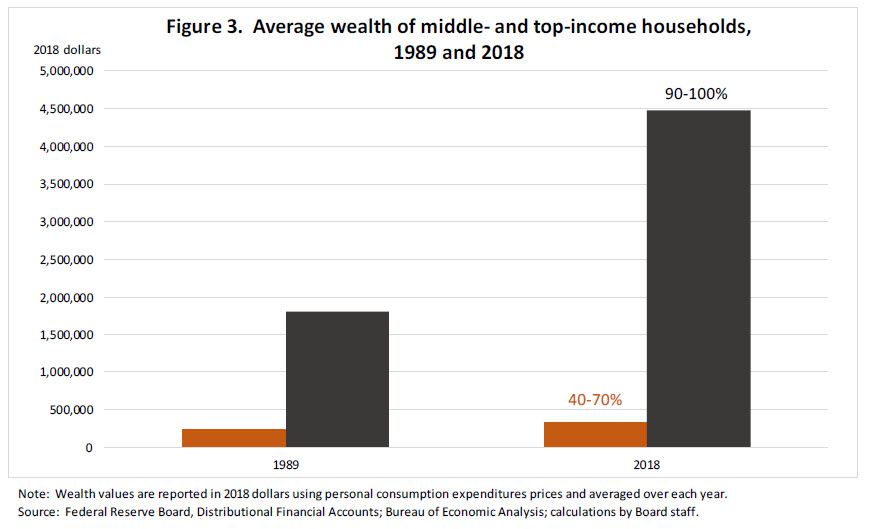 The gap is also large in absolute terms. At the end of 2018, the average middle-income household had wealth of about $340,000, while the average households in the top 10 percent of the income distribution had wealth of about $4.5 million (figure 3). The average wealth of the top income decile is now 13 times higher than that of the middle-income group, while it was 7 times higher in 1989.