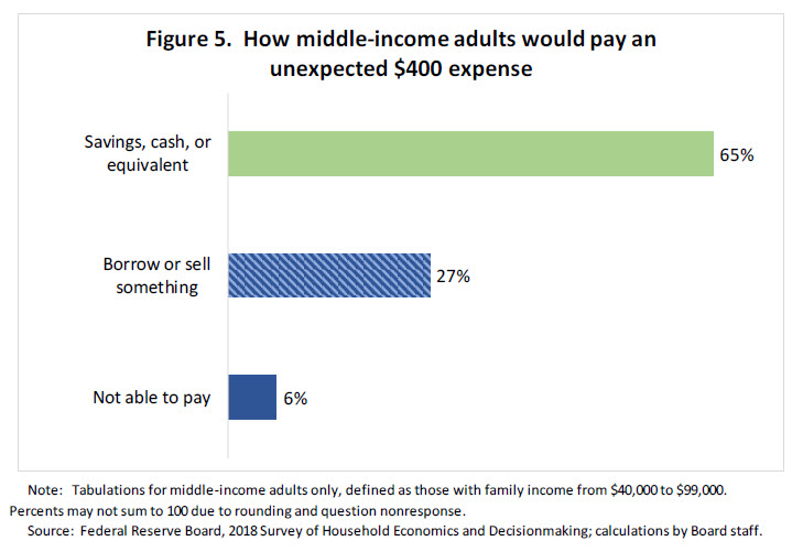 10. This statistic and the rest in this subsection are from the 2018 SHED and are only for middle-income adults. The SHED collects ranges of family income, not a dollar amount. Middle income is defined as the ranges of family income from $40,000 to $99,000, which is roughly the 40th to 70th percentiles. Return to text