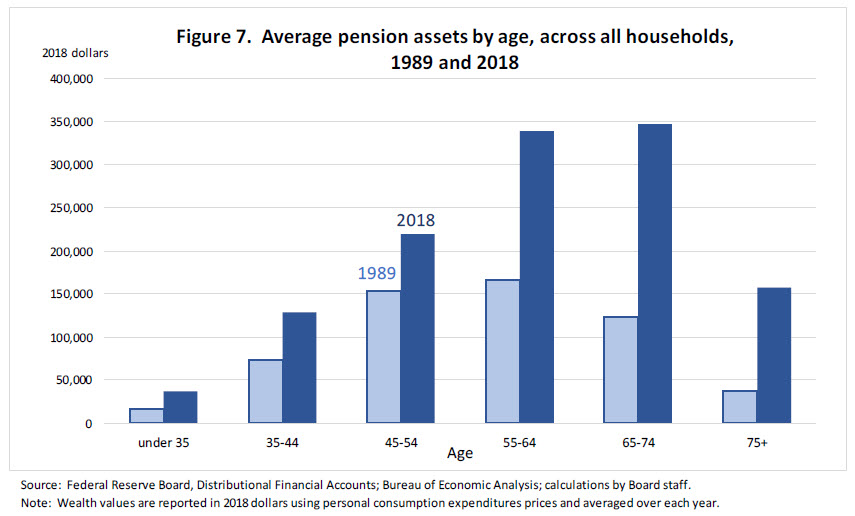 In part, the growth in pension balances reflects the sustained decrease in long-term interest rates over this period, which has boosted the value of the future fixed payments associated with defined benefit pensions. It reflects the aging of the population, since households near or in retirement age have the largest accumulated levels of pension savings and are also likely hold a relatively greater share of defined benefit plans (figure 7).