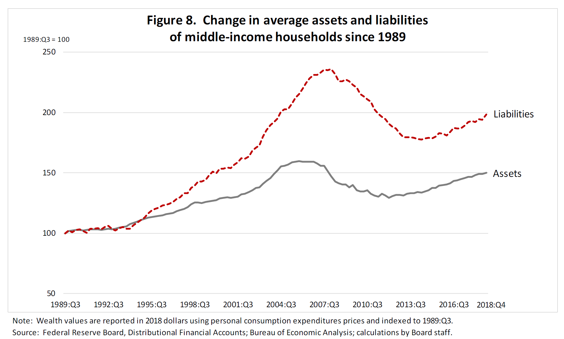 Stepping back, it is instructive to look at the evolution of the underlying assets and liabilities of middle-class households more broadly. The liabilities of the average middle-income household have nearly doubled over the past three decades, while assets have increased only 50 percent (figure 8). The gap between the relative growth of liabilities and assets peaked during the financial crisis and has narrowed somewhat for middle-income households more recently. While mortgages rose and fell sharply around the Great Recession, the rise in consumer debt, such as credit cards, auto loans, and student loans, has been relatively steady.
