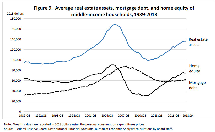 However, the financial crisis brought into focus that there are also risks associated with homeownership. Home equity—defined as the difference between the house value and the mortgage balance—for an average middle-income household peaked at $90,200 in late 2005, then declined by almost two-thirds through 2011 (figure 9). By the end of 2018, after several years of rising house prices, the home equity of the average middle-income family was still below the pre-recession peak and not much above the value in 1989.