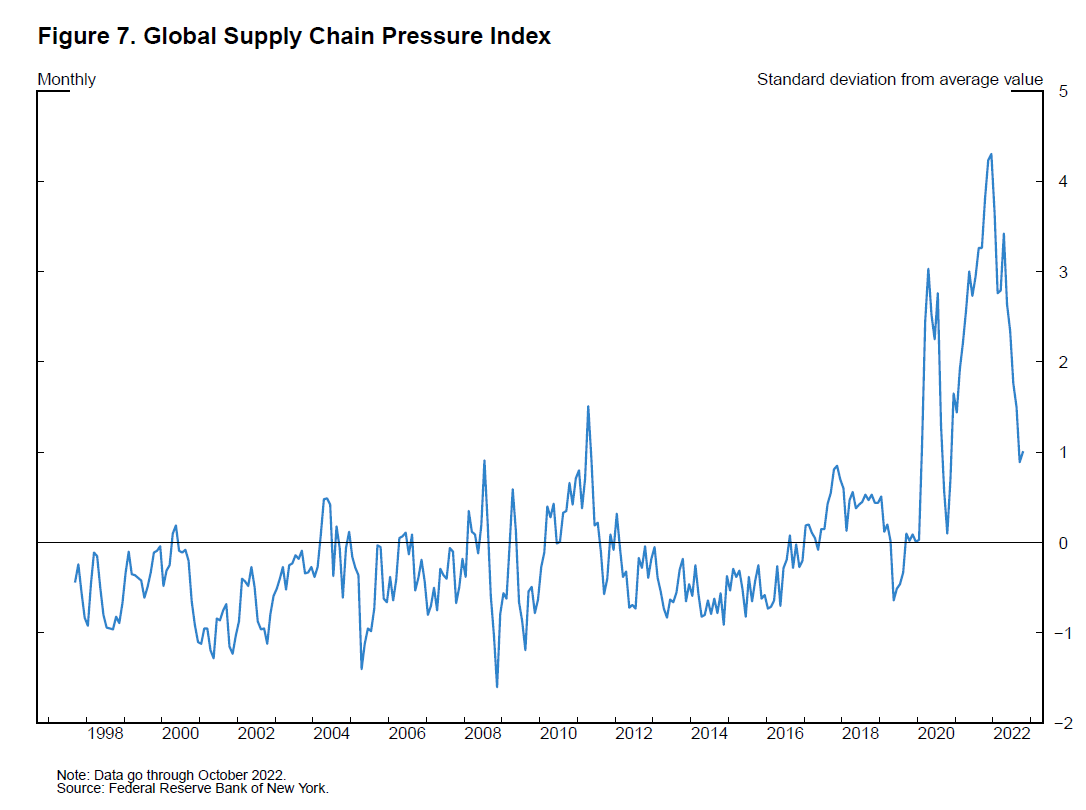 Finally, it is important to explore whether any features of the inelastic supply response associated with the pandemic and the war may have implications for potential growth and macroeconomic stability in the future.11 In particular, despite the unprecedented pandemic policy support for businesses of all sizes that was directed at preserving the supply side of the economy, key sectors struggled to ramp up activity after reopening. The supply response was particularly impaired in sectors where supply chains are geographically fragmented and recurring foreign COVID-19 lockdowns have reduced the reliability of foreign supplies. While conditions have improved dramatically from some of the worst periods in 2021, measures like the Global Supply Chain Pressure Index from the Federal Reserve Bank of New York indicate that total supply chain pressures still are elevated relative to pre-pandemic levels (figure 7).