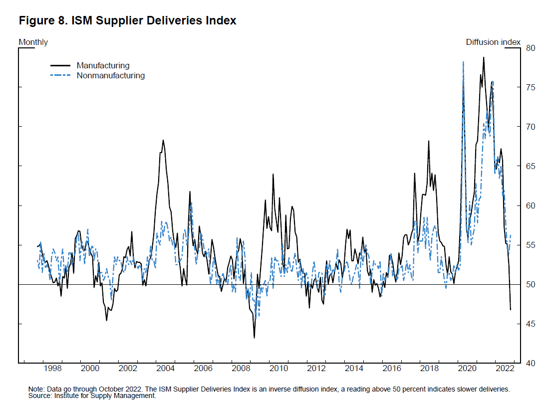 The supply disruptions in key goods and commodities sectors associated with the pandemic and Russia's war against Ukraine have highlighted the fragility of global supply chains and the risks of inelastic supply at moments of stress. Conditions have improved dramatically over the past year, judging by the return of the ISM Supplier Deliveries index to its pre-pandemic range of values (figure 8). That said, ongoing discussions about moving from "just in time" to "just in case" inventory management and from offshoring to "nearshoring" are raising important questions about the extent to which businesses are likely to reconfigure global supply chains based on a reassessment of the tradeoff between cost efficiency and supply resilience.