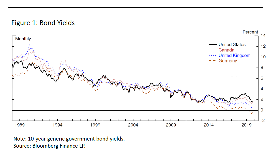 One of the most remarkable and fundamental changes in the global financial landscape over the past three decades has been the steady and significant decline in global sovereign bond yields. From the late 1980s, when 10-year nominal Treasury yields in the United States and sovereign rates in many other major advanced economies were around 10 percent, global bond yields in the advanced economies have trended lower to levels below 2 percent today (figure 1, "Bond Yields").