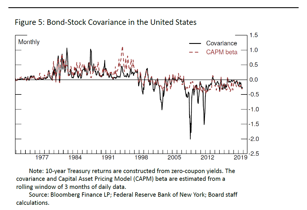"Thus from peak to trough, the realized beta of Treasury bonds has declined by about 0.6 and has changed sign. According to the CAPM [capital asset pricing model], this would imply that term premia on 10-year zero-coupon Treasuries should have declined by 60 percent of the equity premium."11