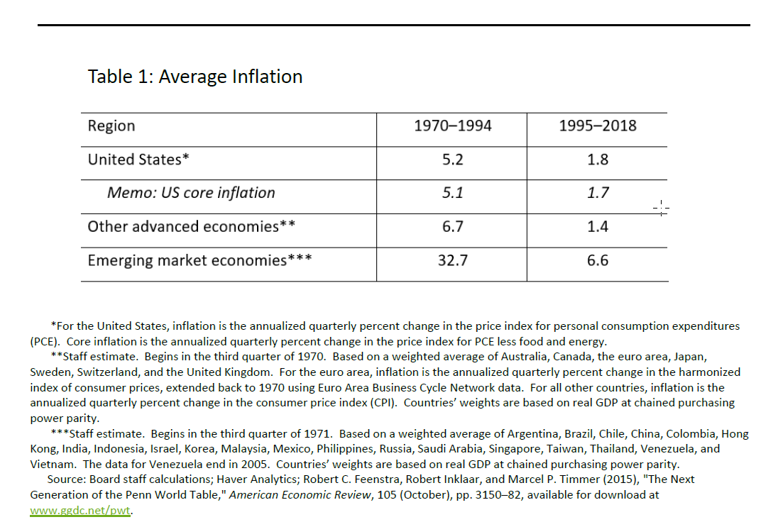 In addition to the decline in r* around the world, lower long-term bond yields also reflect the influence of the initial downshift and ultimate anchoring of inflation expectations in many countries after the mid-1990s. Unlike the decline in r*, which primarily reflects fundamental "real" factors that are outside the control of a central bank, the decline and ultimate anchoring of inflation and inflation expectations in both major and many emerging economies were the direct consequence of the widespread adoption and commitment to transparent, flexible inflation-targeting monetary policy strategies. For example, in the United States, after the collapse of Bretton Woods, inflation spiraled upward, hitting double-digit rates in the 1970s and early 1980s. But by the mid-1980s, the back of inflation had been broken (thank you, Paul Volcker), and total personal consumption expenditure (PCE) inflation averaged less than 4 percent from 1985 to 1990. Following the 1990–91 recession, inflation fell further, and, by the mid-1990s, the conditions for price stability in the United States had been achieved (thank you, Alan Greenspan). From the mid-1990s until the Great Recession, U.S. PCE inflation averaged about 2 percent. And, of course, this step-down in inflation has been global, with the other major advanced economies experiencing a similar shift down (table 1, "Average Inflation Rates"). Many major emerging market economies as well have seen a remarkable and very welcome decline in average inflation rates as a result of adopting and delivering on credible inflation-targeting polices. To the extent that the step-down in inflation is expected to persist, which appears to be the case, long-term yields have reflected this decline one-for-one.
